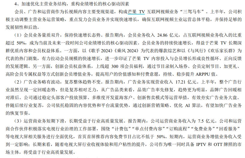 据芒果超媒2024年中报数据,2024上半年,芒果TV的会员业务、广告业务和运营商业务收入分别为24.86亿元、17.21亿元和7.5亿元,占比分别为50.1%、34.7%和15.1%;而在2021年,芒果TV的会员营收还在三成左右。