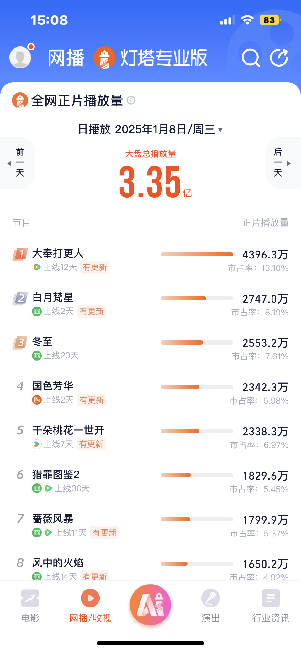 去年6月,优酷副总裁谢颖曾提到,整个网络视听的用户规模超过10亿,而优酷、爱奇艺、腾讯视频、芒果TV四大平台去重后的用户付费数(收费会员数)只有2.5亿左右。从“灯塔”平台每日的播放数据也能看出,即使是《庆余年2》这样的“剧王”在热播期间,整体大盘播放量也只是在3.5亿左右徘徊。这也意味着,各平台剧集之间的竞争几乎是“存量战”。