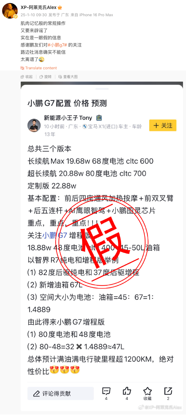 1月10日,小鹏汽车品牌公关负责人@XP-阿莱克氏Alex 发文辟谣网传小鹏G7售价及配置信息,称“太离谱”。网传信息显示,小鹏G7长续航Max版本预计起售价19.68万元,增程版满油满电行驶里程预计超1200公里。