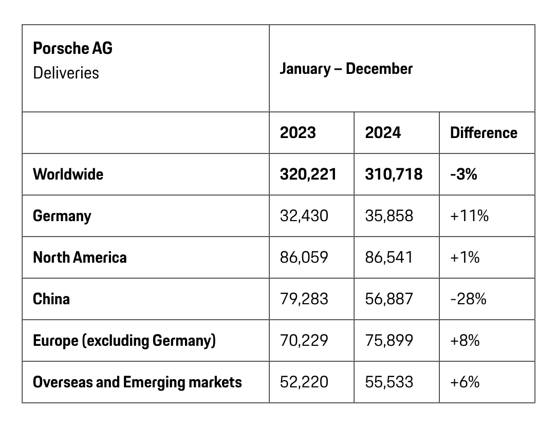 保时捷1月13日公布数据显示,2024年全年共交付310718辆汽车,同比减少3%,在全球五个地区中的四个地区实现了增长,并创造了历史记录。电动跑车的比例从22%增长到27%。其中近一半为纯电动汽车。