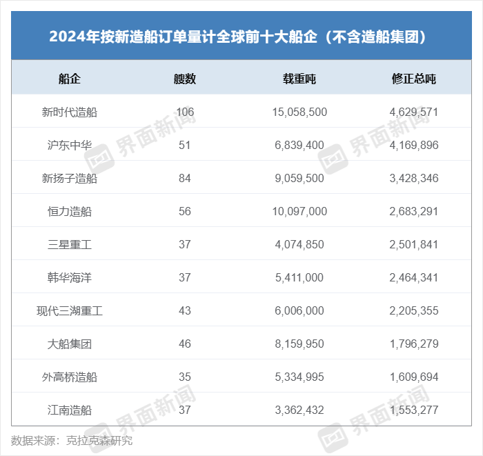 按修正总吨计,2024年新接订单量排名全球前十的企业中,有七家为中国企业,剩余三家来自韩国。