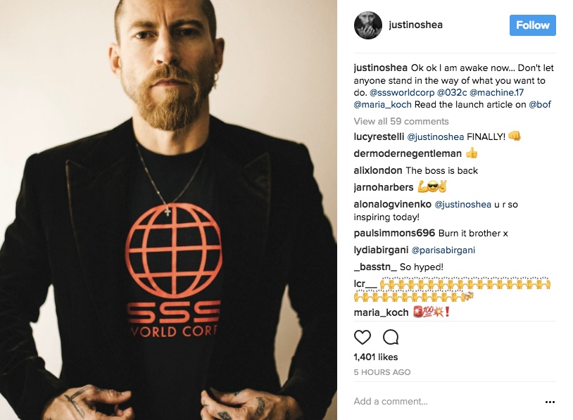 Justin O’Shea亦于个人Instagram账号上宣布了这一消息,照片中他身穿印有SSS World Corp字样Logo的T血衫,并附文:“好啦好啦,我回来了,别让任何人阻挡你要做的事。”