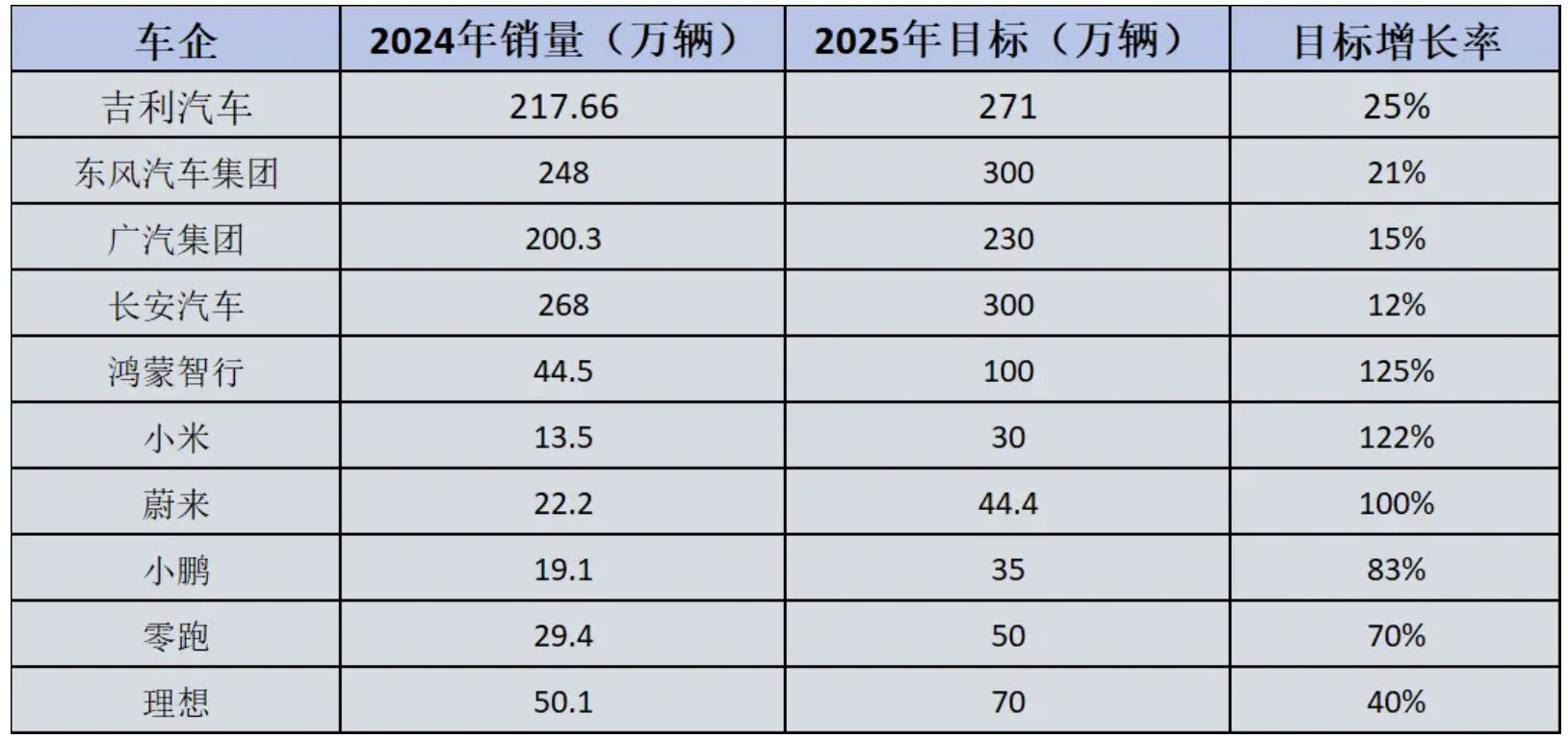 所以进入2025年,车企们也展现出更大的雄心壮志,目前已有多家车企对外公布了2025年的全年销量新目标,设定的目标增长率均远超行业预测值。