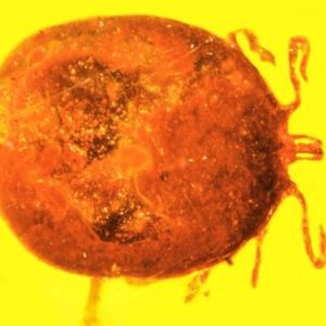 这块来自多米尼加共和国热带丛林的琥珀中封存了一只吸血的蜱虫,其背部有两个小洞。研究人员说,蜱虫被树液包裹时,血液从这两个小洞慢慢渗出,树液后来就变成了琥珀,而血液里的红细胞变成了化石。