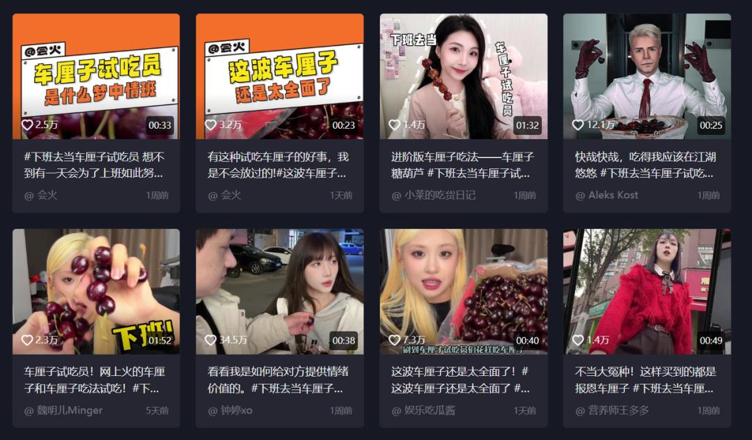 在「全网招募车厘子试吃员」的投稿中,抖音电商最终选出了10个试吃员,去到国内两大车厘子市场进行现场试吃,并且同步和头部达人@青岛大姨张大霞 进行直播连麦,展示了试吃员会吃会挑等花样技能。