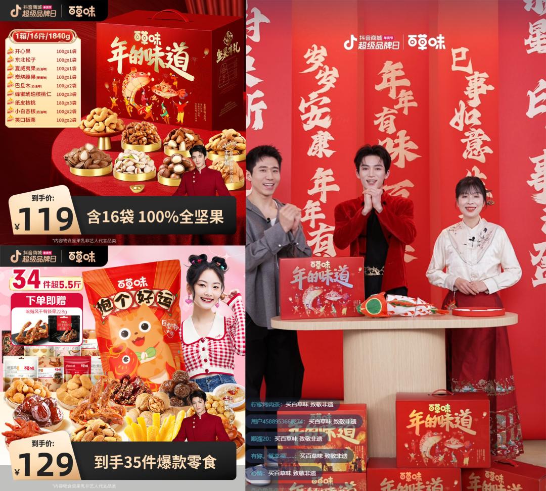 在百草味的直播间里,品牌请来了代言人王星越和非遗鱼灯传承人潘敏,现场做起了非遗鱼灯,在春节申遗成功之后的第一个年货节,击中了大家对于传统文化的自豪感,也顺势带出年俗礼盒这一特色货品。最终,这场直播的 GMV爆发45倍,场观爆发20倍+。