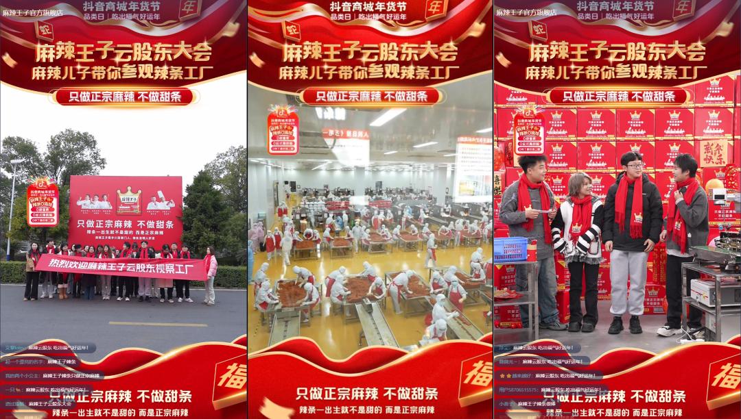 当他带着一群与他同龄的云股东们,系着红围巾,讲着塑料普通话,穿行在工厂的各个角落,比拼着谁吃辣条吃得更多时,像极了过年回家的同学聚会,这也让直播间内的用户停留时长提升近4倍,互动率提升3倍。