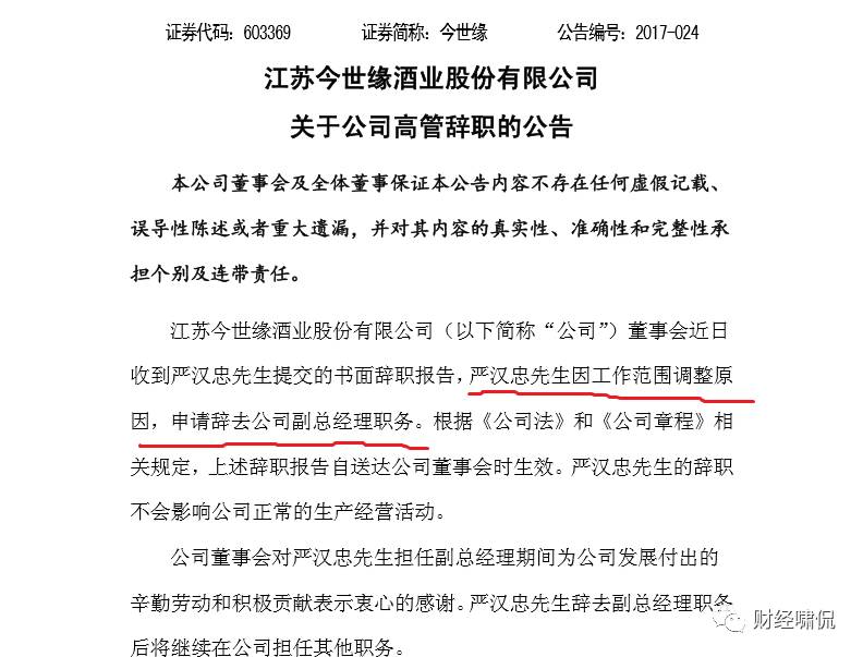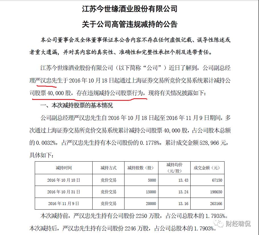 虽然今世缘方面没有具体透露严汉忠辞职原因,但众所周知的是,在担任今世缘副总经理之后,严汉忠因为违规减持股票,遭到监管部门关注。