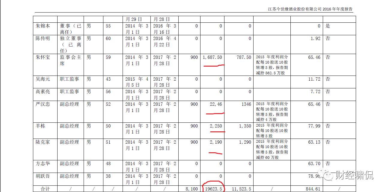 尽管产销量连续三年萎缩,但依旧无法改变今世缘收入、利润增长的事实,更无法阻挡今世缘高管们“一夜暴富”的脚步。
