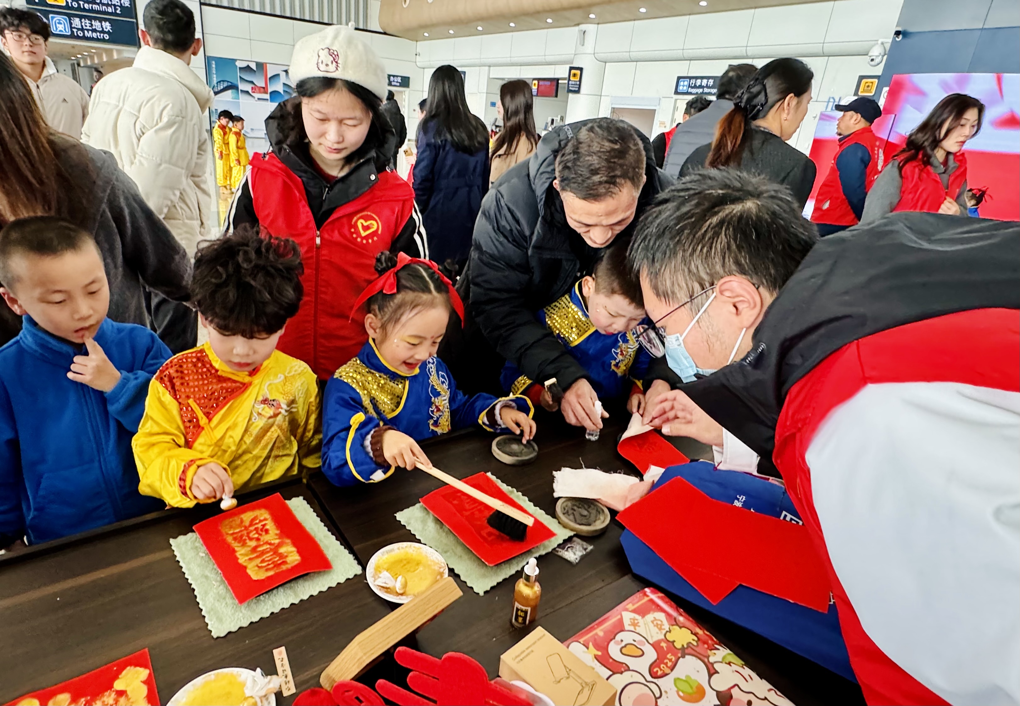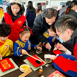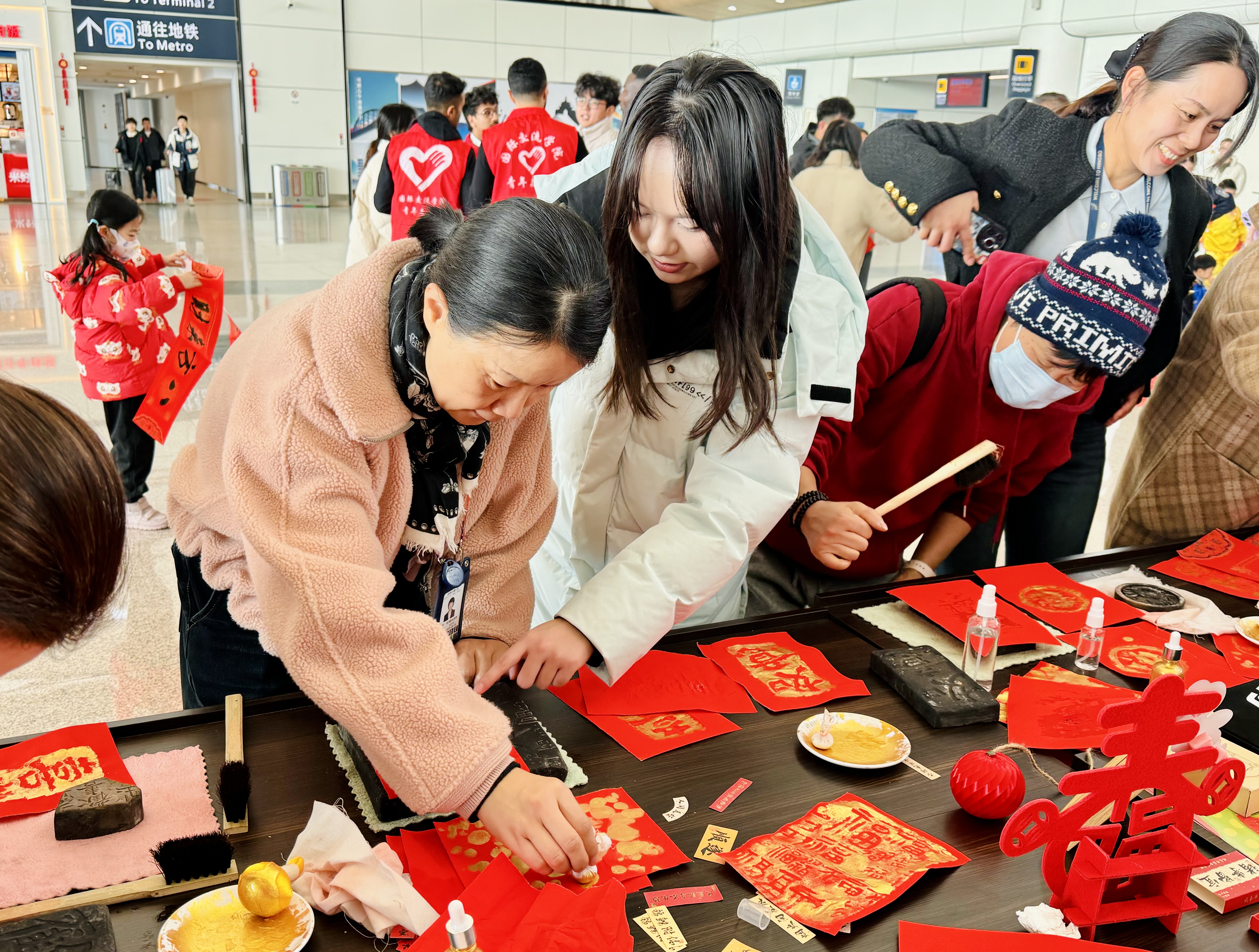 与此同时,在宁波机场T1航站楼大厅,宁财院环境设计专业大二学生叶子祺带着同学们打造的“古韵新拓,艺起迎春”非遗拓印体验区成为了旅客们争相体验的热门打卡点。在大学生们精心准备的拓版上,平安、喜乐等祝福语图案熠熠生辉,吸引着众多旅客前来体验这一古老的非遗技艺。志愿者们耐心地向旅客们介绍拓印的步骤和技巧,指导他们如何选择合适的拓纸、如何均匀涂抹墨汁、如何轻压拓版。在志愿者们的帮助下,一张张承载着传统文化韵味的拓印作品在旅客们的手中诞生,为他们的旅程增添了一份独特的纪念。
