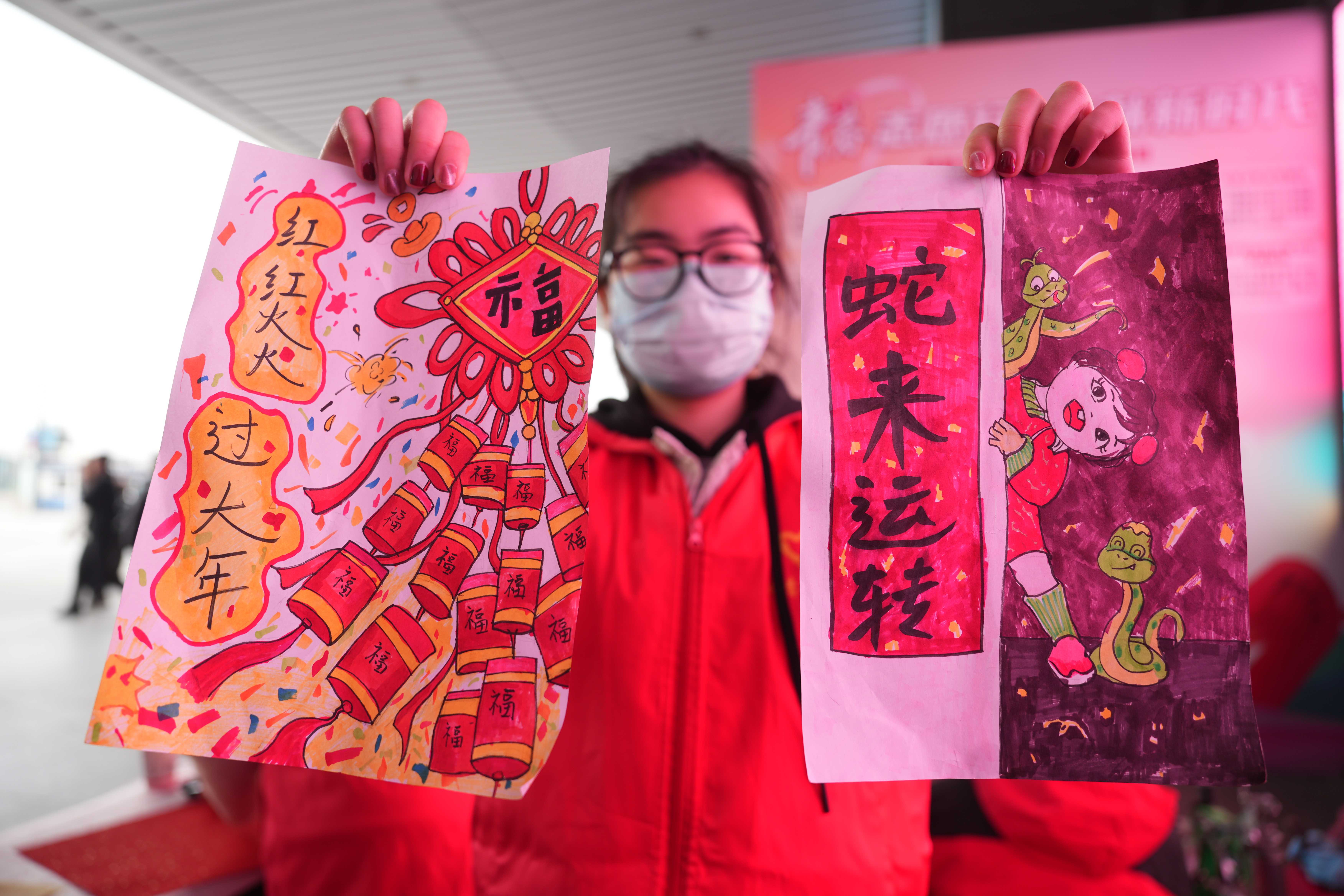 早上8点半,宁财院艺术学院数媒专业大二学生王悦已经准时到岗,她身着志愿者服装,手握画笔,化身为传递祝福的使者。在她的笔下,鞭炮、雪人、金蛇、福字等寓意喜庆美好的元素跃然纸上,一幅幅栩栩如生、充满年味的年画在她的巧手下诞生。年画上的“蛇来运转”“红红火火过大年”“万事胜意”“未来可期”等吉祥语,不仅传递着美好的祝愿,更展现了大学生们的创意与热情。