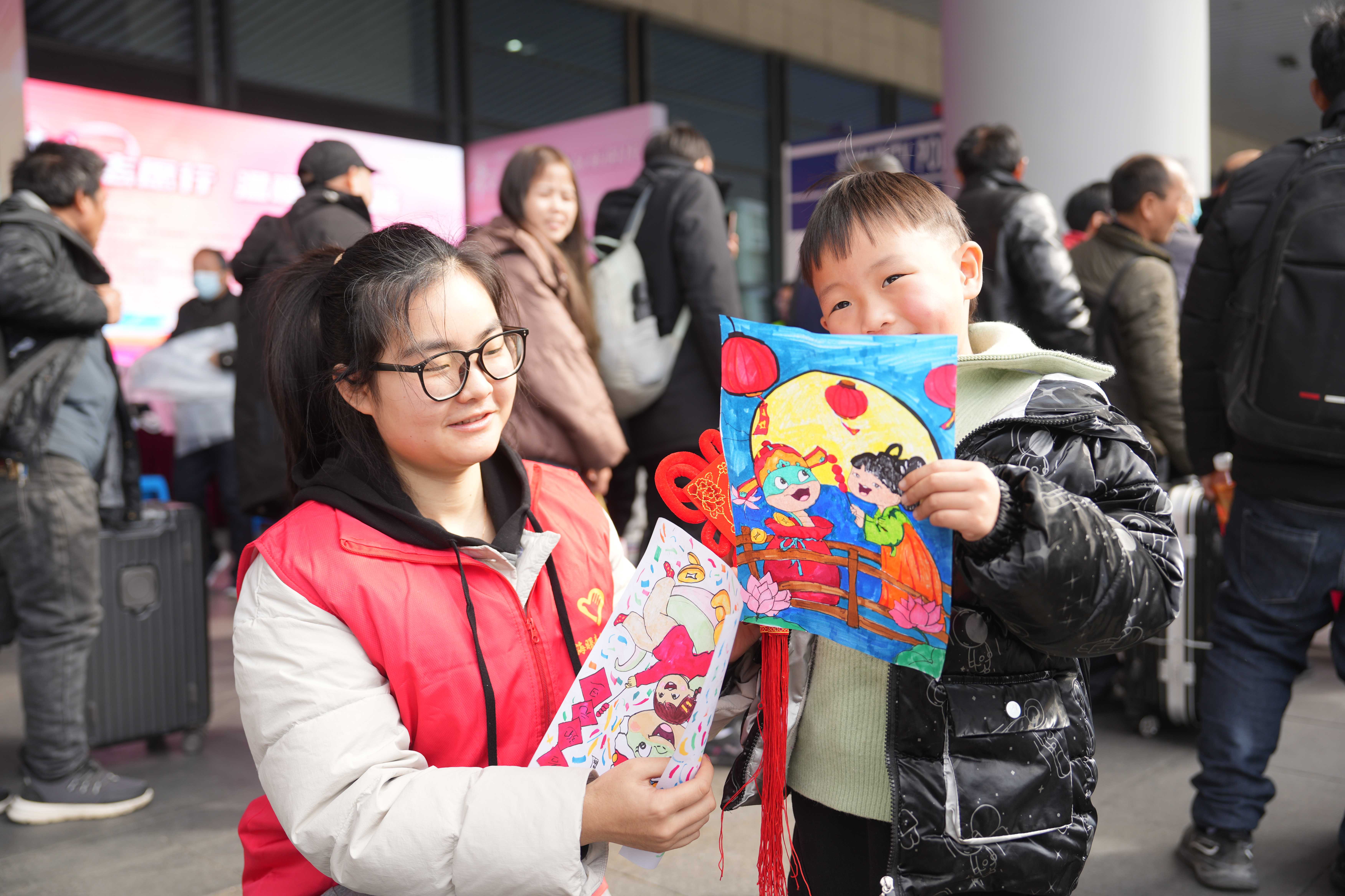 上午11点许,一对前往湖北荆州的母子拖着行李来到了火车站南广场的服务摊位前。当母亲张女士接过王悦赠送的年画时,脸上洋溢着幸福的笑容:“我儿子5周岁了,今天带他回老家跟外公外婆过年,这份年画礼物很特别,他非常喜欢。”这份独特的礼物,不仅让这对母子感受到了来自志愿者的温暖与关怀,更为他们的归家之路增添了一份别样的色彩。