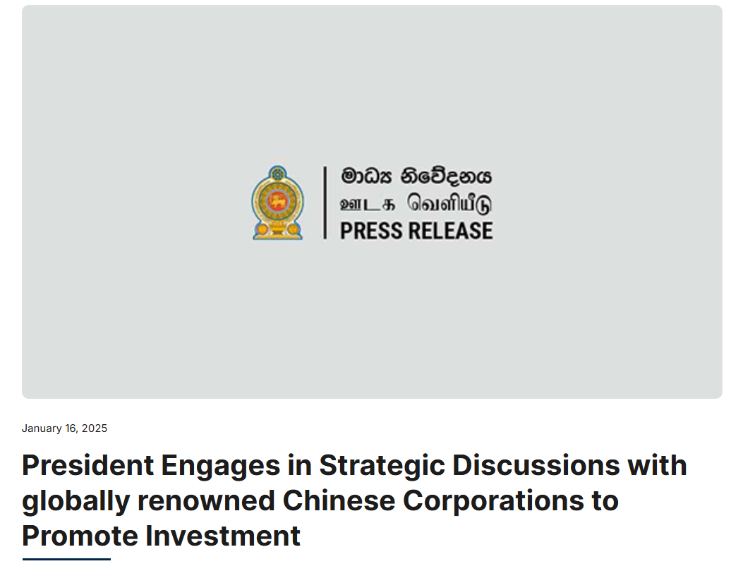 斯里兰卡政府1月16日发布声明称,在访华期间,斯里兰卡总统阿努拉·库马拉·迪萨纳亚克同多家中企开展战略讨论,包括比亚迪、华为、中国交通建设集团、中国石油化工集团和中国冶金科工集团。