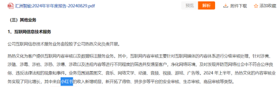 而汇洲智能所经营的业务与小红书能产生直接的经济收益。根据2024年汇洲智能半年报信息显示,汇洲智能子公司热热文化是一家为客户提供互联网内容审核以及数据标注服务的企业,2024上半年内容审核业务实现了同比增长,其中来自小红书的收入新增明显,另外还新开拓了得物、拼多多等平台的安全审核、生态审核、商品审核等类型。
