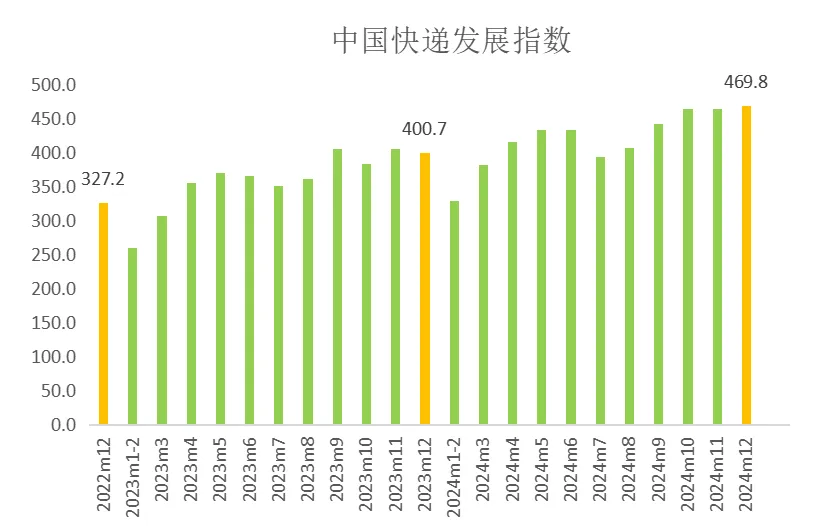 国家邮政局消息,经测算,2024年12月中国快递发展指数为469.8,同比提升17.2%。其中发展规模指数、服务质量指数和发展能力指数分别为636.2、649.4和256.6,同比分别提升28.4%、15.6%和1.2%,发展趋势指数为71.1。12月,快递业持续向好发展,市场规模较快增长,服务质效有所提升,国际市场拓展有力,超预期完成2024年发展目标。