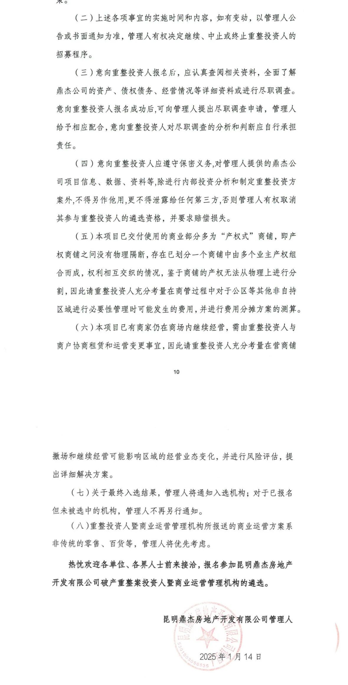 《公告》明确了意向重整投资人的报名条件,拟报名参与大都重整暨商业管理的投资人,需拥有足够的资金实力,前期投资不低于1000万元,具有较高品牌知名度,有意向者。即日起至2025年2月14日前与管理人联系。