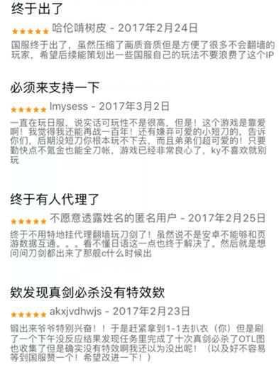自《刀剑乱舞-ONLINE-》国服于2月22日在iOS 上线至今,在iPhone免费榜游戏区的最好排名是第7名,游戏畅销榜最好成绩则是54名。玩家评论以5星评论居多,不过在评论区可以发现,评论的玩家有大半都是在日本有过刀剑页游经历的老玩家。