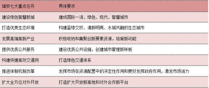雄安新区建设的7 个重点任务中有4个都与基础设施相关(建设绿色智慧新城、打造优美生态环境、提供优质公共服务、构建快捷高效交通网),体现了新区建设初期对于基础设施的迫切需求。