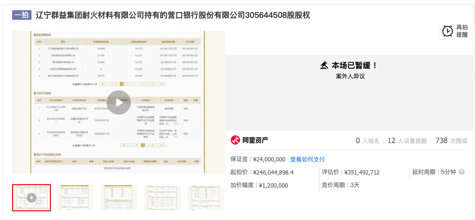 1月20日,界面新闻记者从阿里资产拍卖平台获悉,原定于1月24日进行公开拍卖营口银行3.06亿股权,由“即将开始”变更为“已暂缓”,暂缓原因显示为案外人异议。