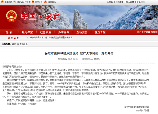 4月6日,保定市人民政府官方微信号“保定微讯”发布《保定市住房和城乡建设局致广大市民的一封公开信》。