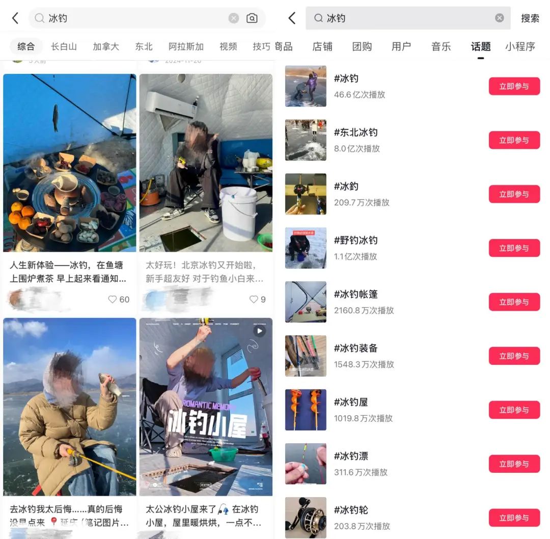 图:社交平台与“冰钓”相关的分享内容来源:小红书(左)、抖音(右) 《听筒Tech》截图