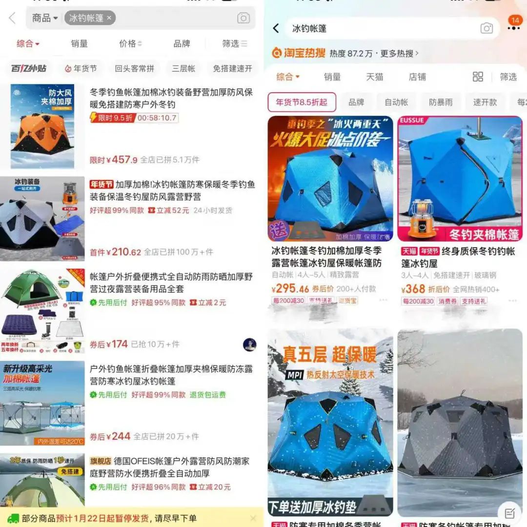 图:电商平台“冰钓帐篷”的销售情况来源:拼多多(左)、淘宝(右) 《听筒Tech》截图