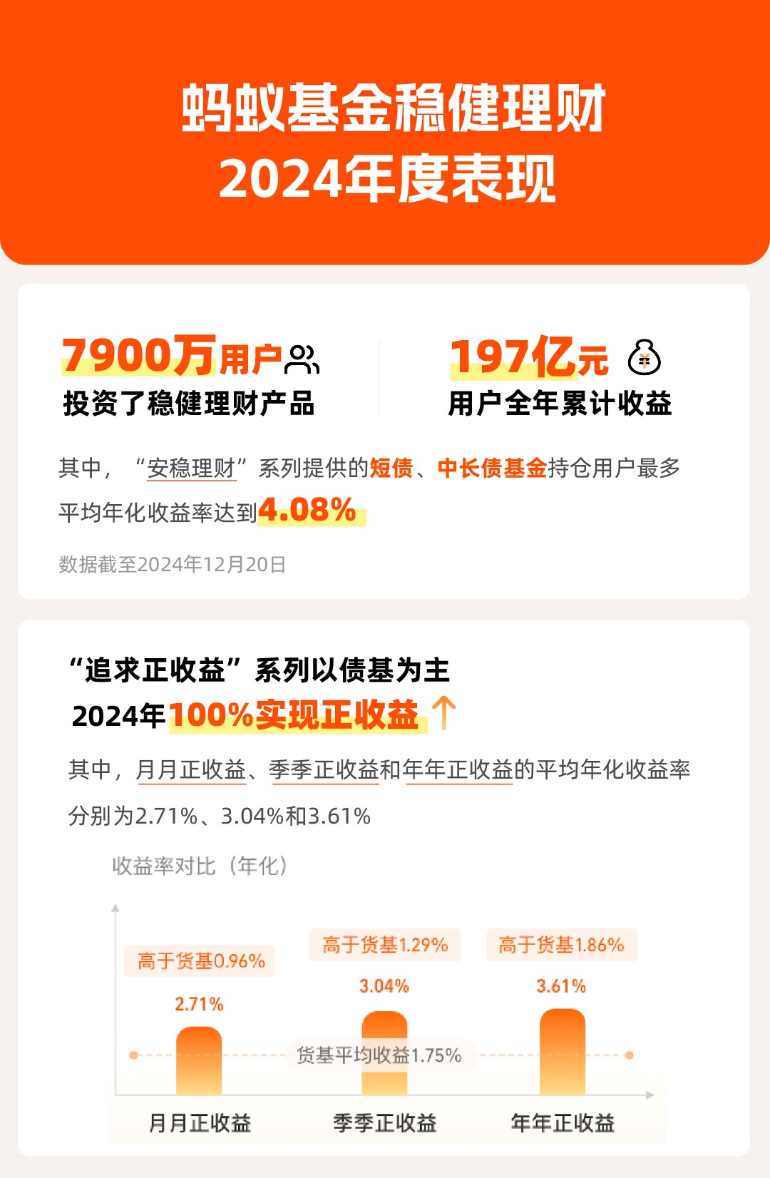 回顾2024年债市表现,尽管曾经历了8月和9-10月的两次回调,但全年依然走出了“债牛”行情。根据蚂蚁基金公布的数据显示,2024年稳健理财的“安稳理财”系列收益稳定,包含月度、季度和年度不同持有期限的债券基金,其中短债、中长债用户持仓最多,全年平均收益率达到4.08%。