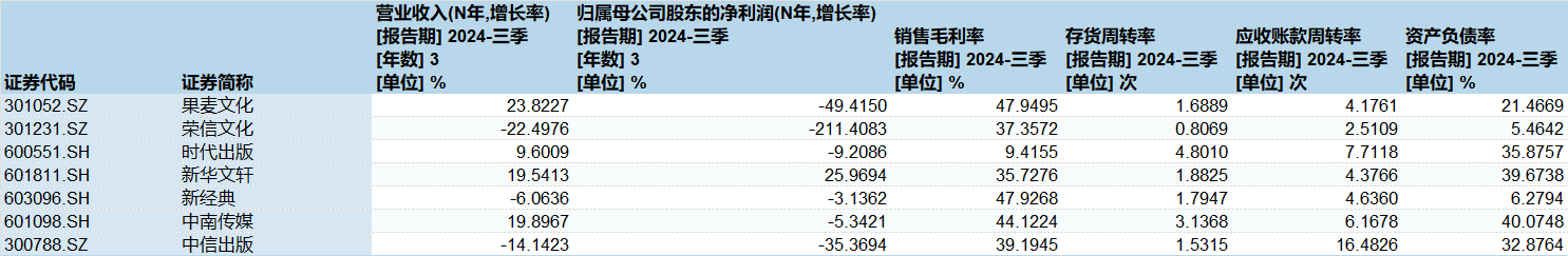 以同业可比上市公司果麦文化(301052.SZ)、时代出版(600551.SH)为例,截至2024年三季度末,这两家公司3年间的营收年复合增长率分别为23.82%、9.6%;归母净利润年复合增长率分别为-49.41%、-9.21%;2024年三季报销售毛利率分别为47.95%、9.42%。