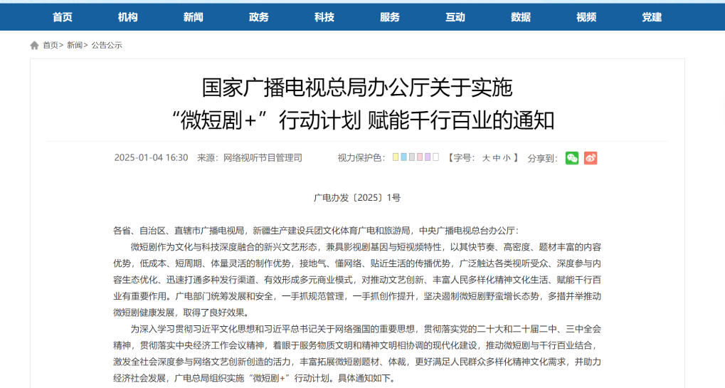 在1月3日至4日召开的2025年全国广播电视工作会议上,短剧作为重点被多次提及,一是制定《微短剧管理办法》,在繁荣发展和规范管理并举上下功夫;二是发布“微短剧+”行动计划赋能千行百业的通知,在文旅、普法、非遗宣传、经典学习等多个领域,推出300部左右具有创新价值的短剧。