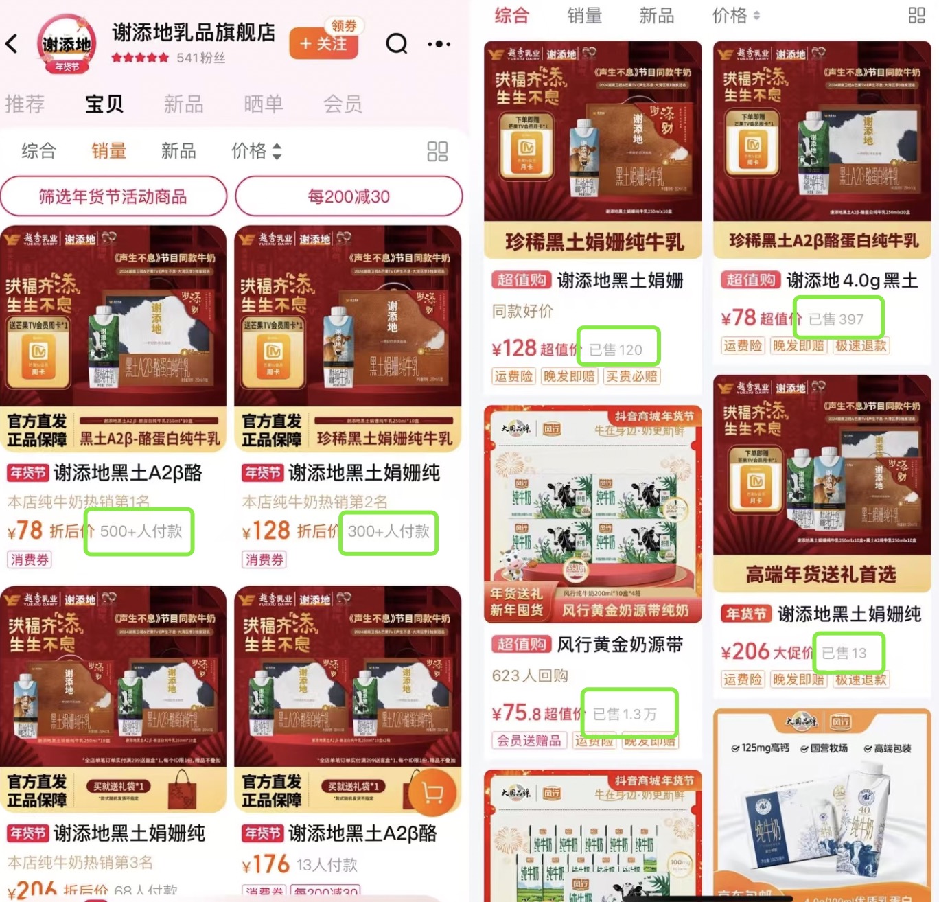 销售表现最好的,是在抖音平台的辉山官方旗舰店,店内谢添地销量最大的一款单品为价格128元的“谢添地梦幻盖4.3g黑土地娟姗纯牛乳”,销量4.1万件。而这家店的最高销量产品为价格39.9元的辉山早餐纯牛奶,销售69万,而且这款平价牛奶一件为24盒,与谢添地10盒的一箱的分量相比更为实惠。