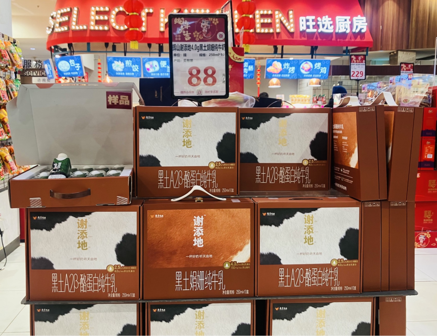 界面新闻在北京一家永旺超市看到,售价88元的谢添地产品以牛奶堆头的形式陈列,并有一箱打开盒子的样品,与谢添地陈列在一起的,还有125元的三元极致1+1原生双蛋白纯牛奶、49.9元的特仑苏有机纯牛奶、46.9元的三元极致礼盒装纯牛奶等产品。一名顾客表示木质包装盒有点浪费,所以牛奶贵是因为“羊毛出在羊身上”,也有消费者发出“粤语谢添地是什么意思”、“谢添地创始人是潮汕人吗”之类的疑问。