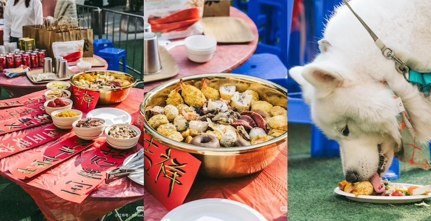 年年有余、金玉满堂、圆满吉祥…..这份新春盆菜菜单并不仅仅是给人类提供的,它们分别对应的是丸子汤、咖喱炒饭,以及包含了鹿肉、鸡肉、三文鱼等食材的盆菜,真正大饱口福的则是猫猫狗狗们,它们像主人一样在红桌布、塑料凳的包围下,享用这种流行于粤港澳地区、有着“团圆聚气”寓意的传统盆菜。