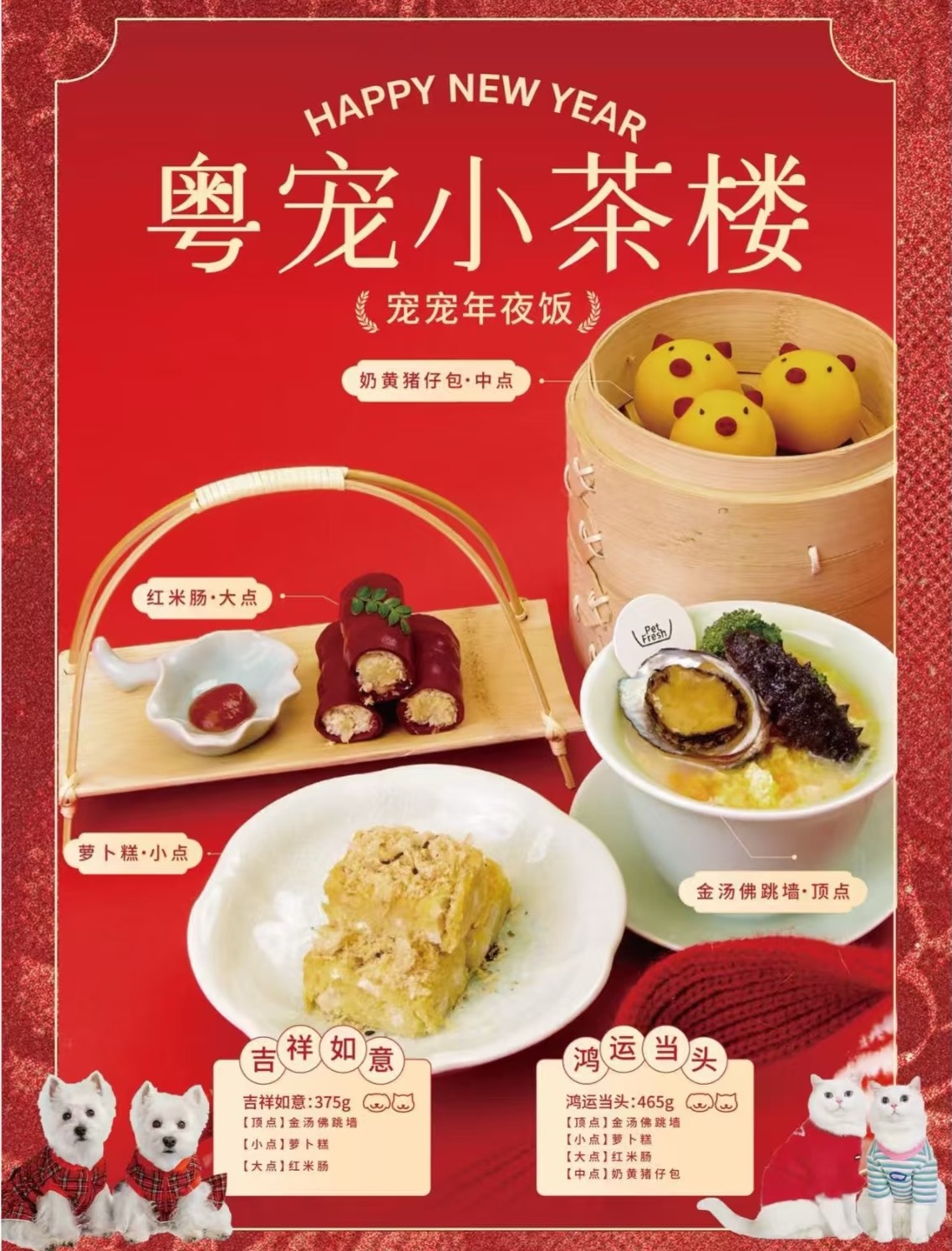 不仅是宠物品牌们想到要为猫猫狗狗们办席,豪华酒店如深圳福田香格里拉酒店也在尝试做“宠物友好年夜饭”,在主人吃宴席的同时设置特定专区供宠物休息及用餐,此外也设置萌爪签到及全家福拍摄等活动。而广州香格里拉酒店还模拟了粤菜茶楼的点心,把宠物年夜饭的氛围感拉满,包括萝卜糕、奶黄包和佛跳墙等经典菜品。