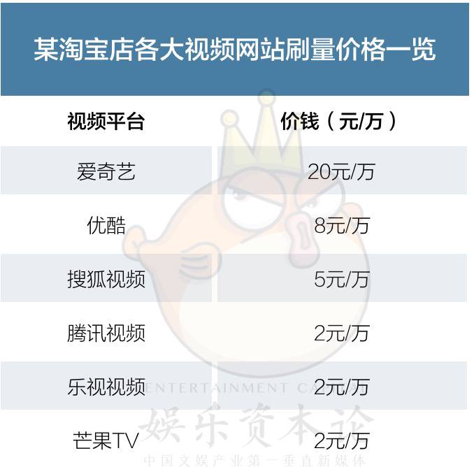 一家不做准,另一家淘宝店主给小娱的价格体系是:爱奇艺(20元/万)、优酷(8元/万)、搜狐视频(5元/万)、腾讯视频/乐视/芒果TV(2元/万)。