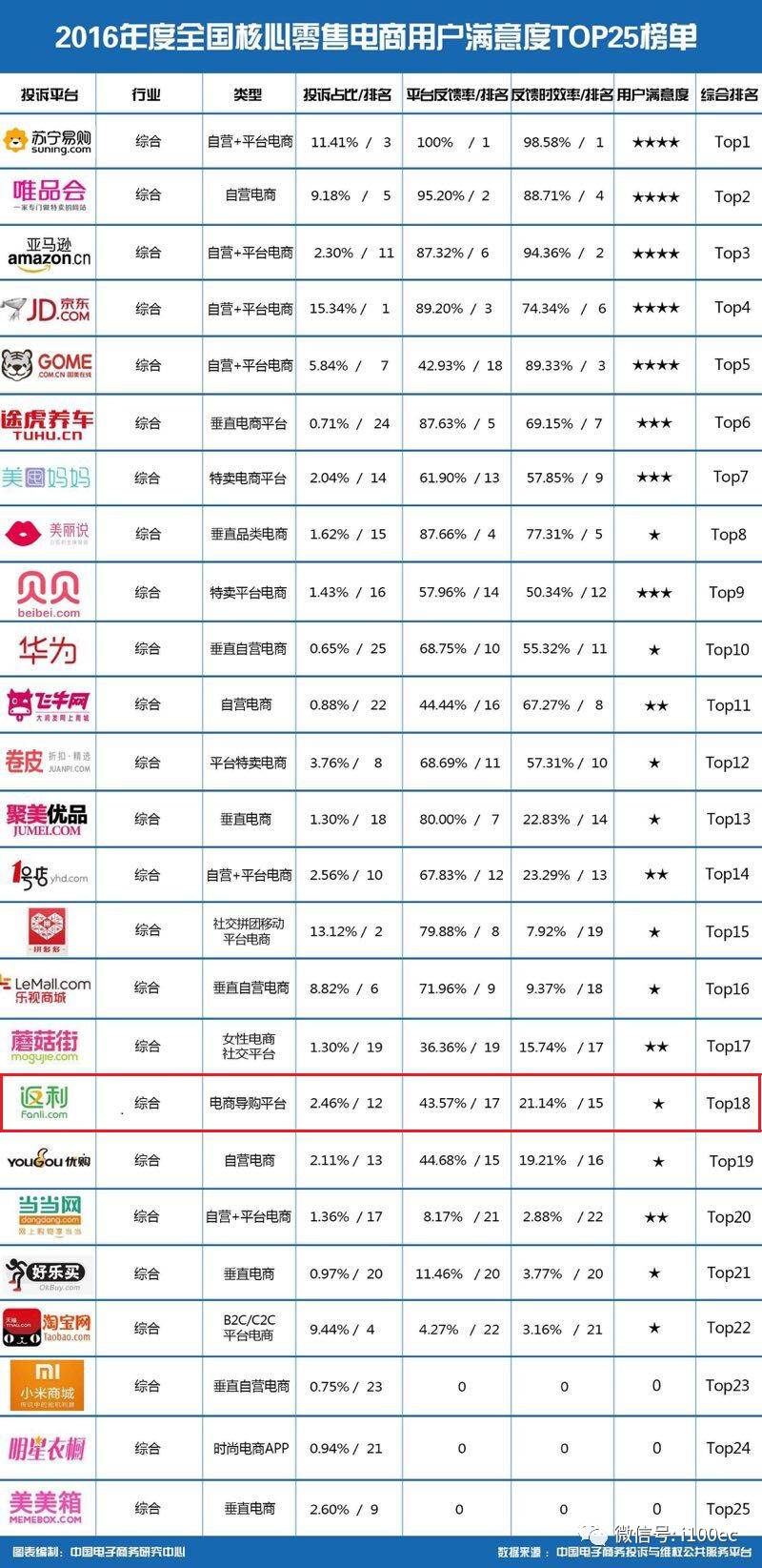 据“2016年度全国核心零售电商用户满意度TOP25榜单”显示,飞牛网、卷皮网、聚美优品、1号店、拼多多、乐视商城、蘑菇街、返利网、优购网、当当网、好乐买、淘宝网/天猫(C2C集市卖家及品牌卖家)、小米商城、明星衣橱、美美箱为“2016年度全国核心零售电商用户满意度TOP25榜单”后十五位,平台反馈率、处理时效性、用户满意度较差;而苏宁易购、唯品会、亚马逊中国、京东、国美在线、途虎养车网、美囤妈妈、美丽说、贝贝网、华为商城入选“2016年度全国核心零售电商用户满意度TOP25榜单”前十位,平台反馈率、处理时效性、用户满意度相对较好。