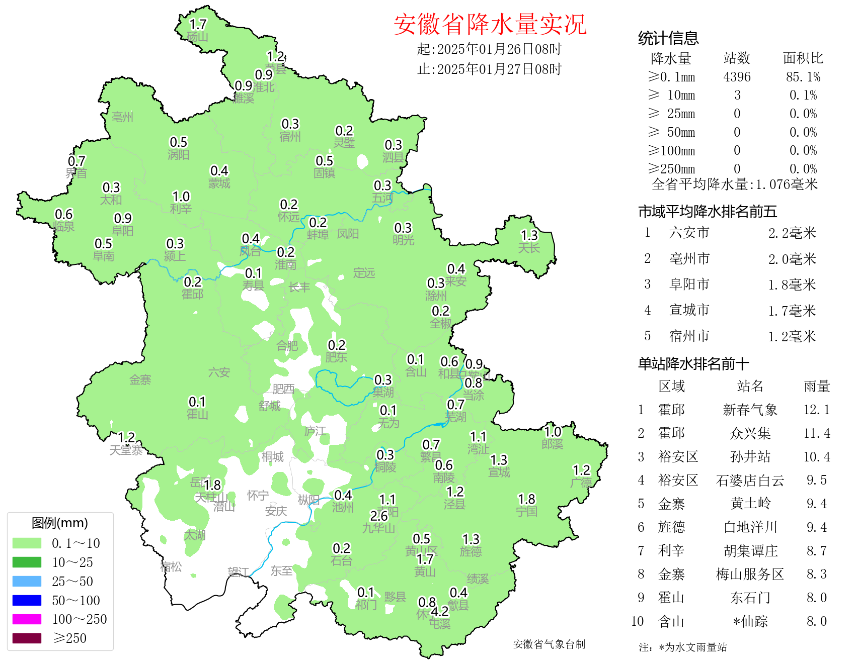 雨雪:昨天全省大部分地区出现小雨,最大霍邱新春气象12.1毫米;淮北部分地区、天柱山和黄山光明顶出现雨夹雪或雪。截至今天08时,黄山光明顶和九华山积雪深度分别为7厘米、1厘米。