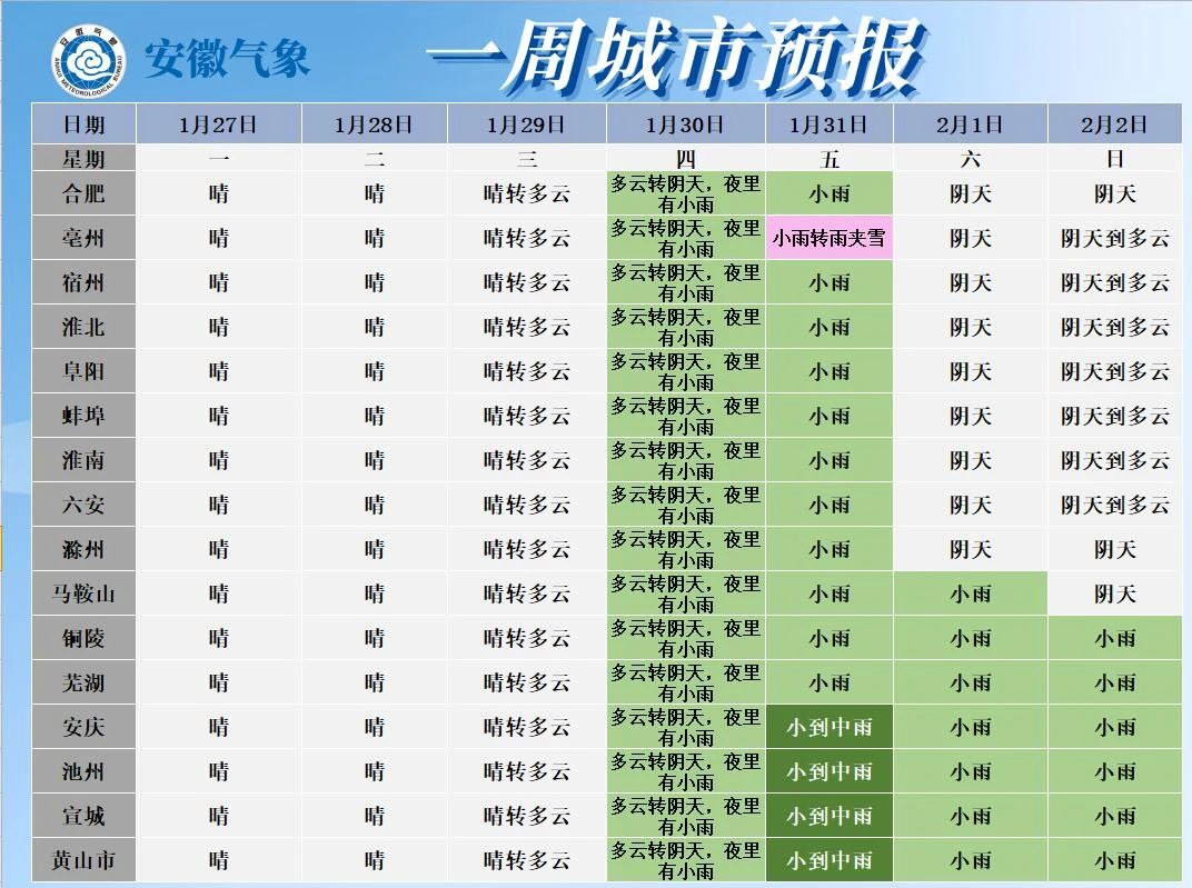 31日(初三):全省阴天有小雨,其中大别山区和沿江江南部分地区中雨,淮北地区北部和大别山区有小雨转雨夹雪。