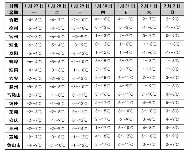 明天起至30日安徽省气温明显回升。今天全省平均风力3级左右,山区和水面阵风6级。28日早晨最低气温:淮北地区和本省山区-9~-6℃,沿江地区-4~-2℃,其他地区-6~-4℃。28-30日(除夕至初二)全省气温明显回升。受冷空气影响,31日至2月4日(初三至初七)全省平均气温将下降6~9℃。