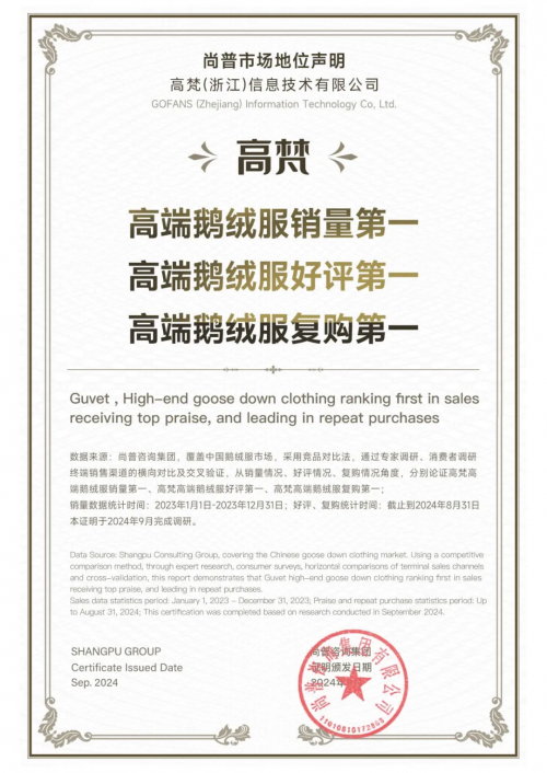 高梵将“世界级中国高端品牌”的愿景转化成行动,用技术打造极致产品。2023年,高梵与中科院联合发布了中国首个《鹅绒服白皮书》,官方认证品牌将引领鹅绒服品类发展。高梵已连续两年为中国极地中心南极科考船提供极地航海装备,在央视权威测评中完胜美国、加拿大极地装备,达到世界领先水平。