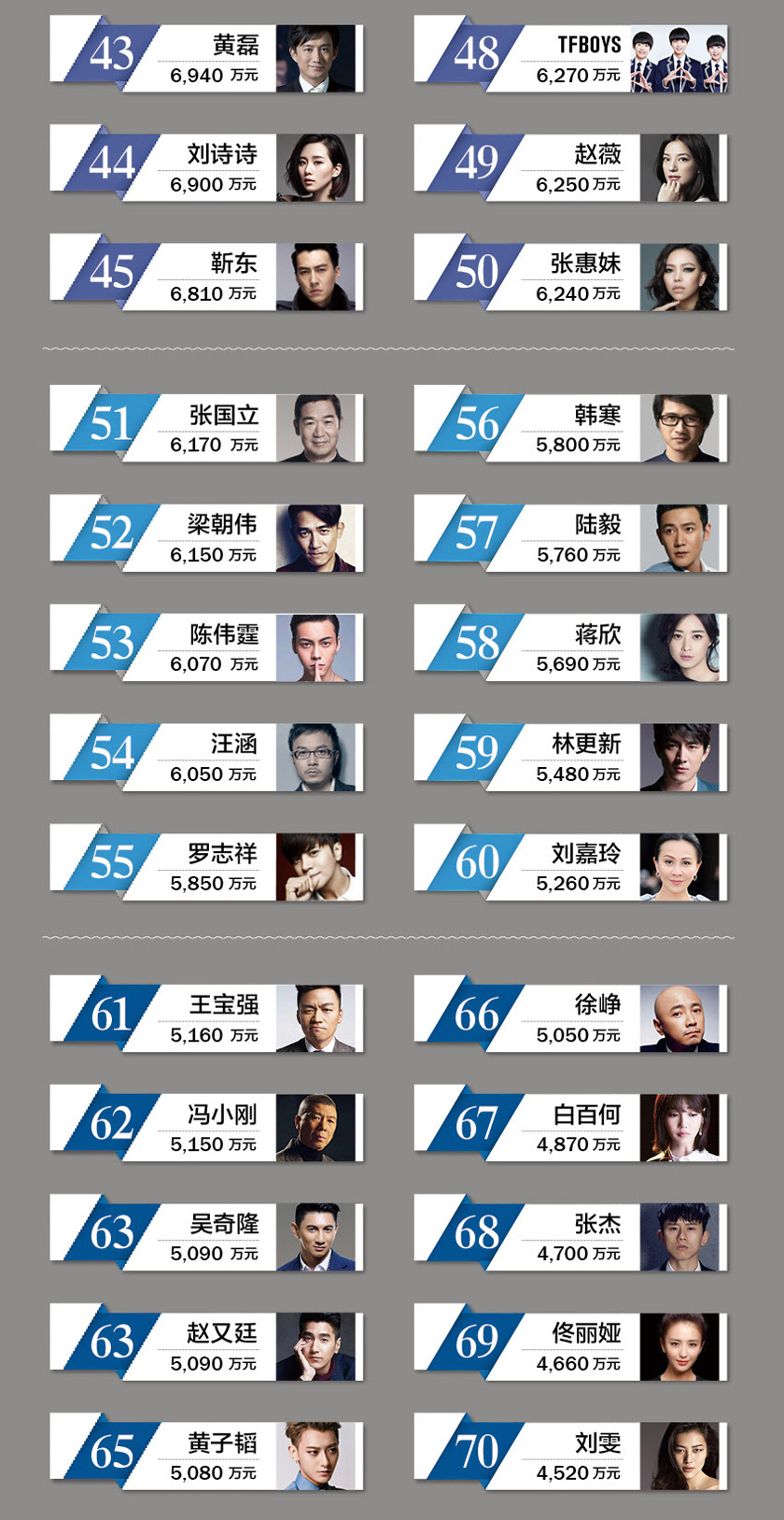 大哥成龙(收入榜第5名)仍然活跃在电影事业第一线。2016年,成龙以老题材拍出新创意的《绝地逃亡》、《铁道飞虎》上映,在进行各种宣传活动的同时,开拍了《机器之血》,这部新电影有望在今年上映。年过花甲,活力不减,凭借对电影事业的贡献,成龙荣获奥斯卡金像奖终身成就奖。