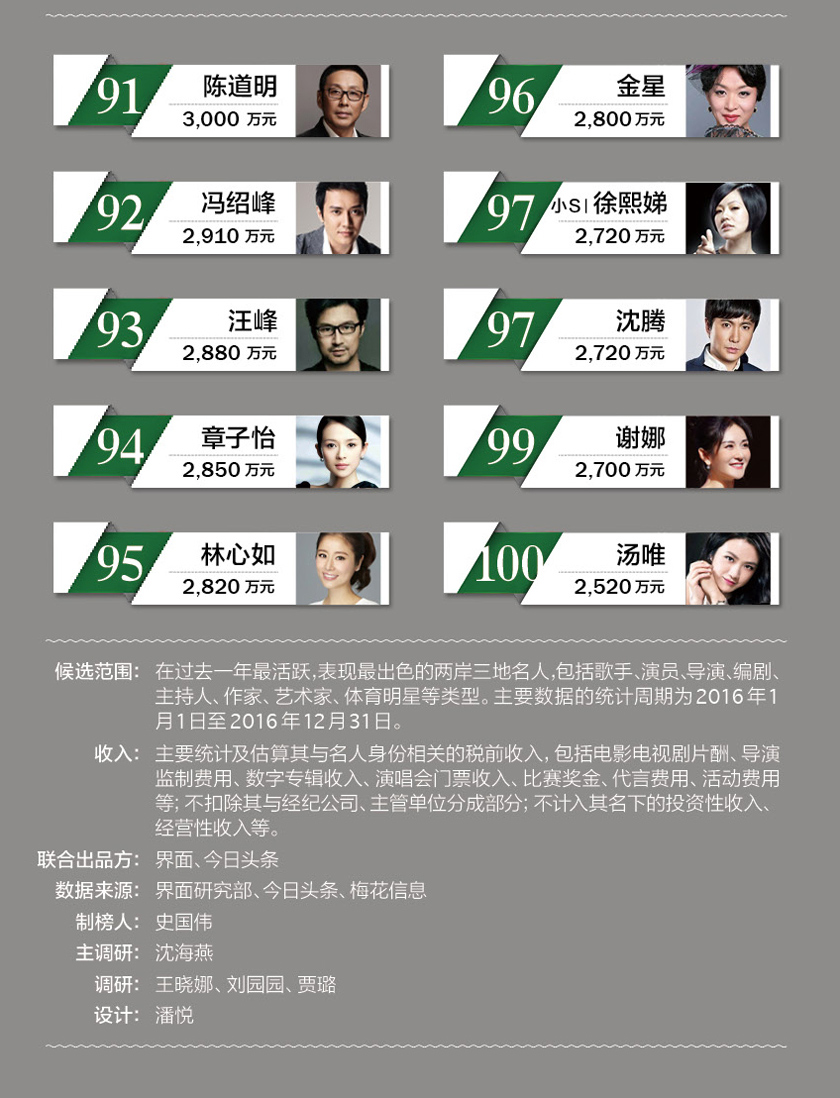 具体而言,界面·头条2017中国名人商业价值榜的考察对象为,在过去一年最活跃、表现最出色的两岸三地名人,包括歌手、演员、导演、编剧、主持人、作家、艺术家、体育明星等类型。中国名人商业价值榜以其2016年度估算收入、传统媒体曝光度、移动互联网热度三项指标综合评价排名。与主要职业相关的收入直观地体现了名人一年来的工作成绩,传统媒体曝光、移动互联网热度则反映了大众和媒体对其的关注度,一定程度上也体现了名人对市场的影响力。最终有100位名人入选。