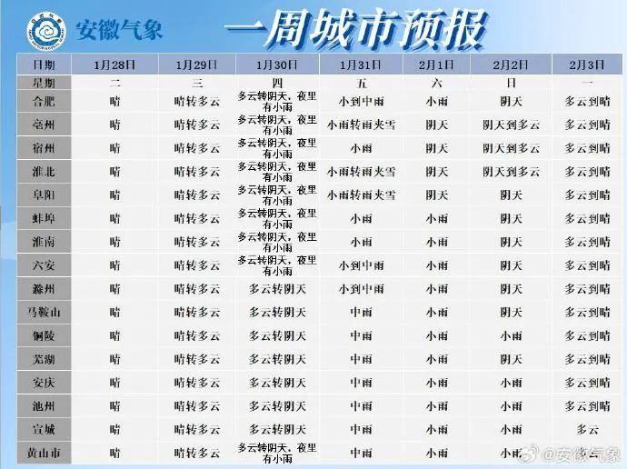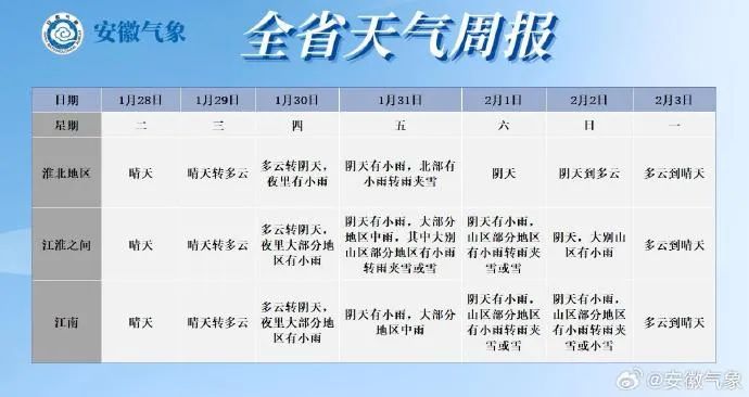 安徽省气象台预报,30日夜里至2月2日(初二夜里至初五)安徽有一次雨雪天气过程,其中31日大别山区和沿江江南部分地区中雨,淮北地区北部和大别山区有小雨转雨夹雪;2月1-2日我省山区部分地区有小雨转雨夹雪或小雪。