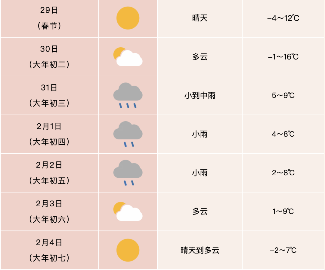 气温方面,28-30日(除夕至初二)安徽省气温明显回升。30日淮北地区最高气温12~14℃;江淮之间14~16℃;江南16~18℃。受冷空气持续影响,31日(初三)起全省平均气温将逐渐下降。