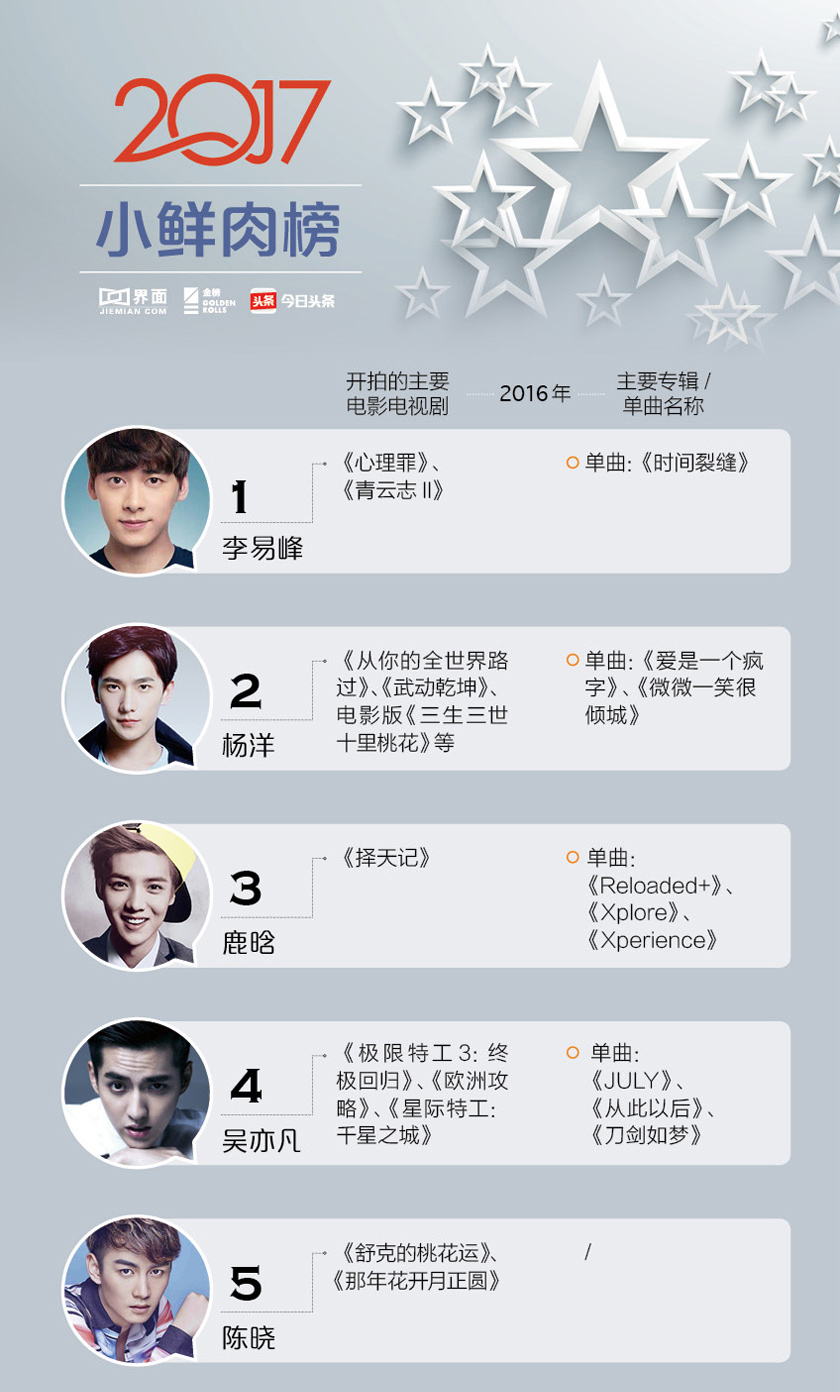 在2017小鲜肉移动互联网热度榜上,李易峰、杨洋、鹿晗、吴亦凡、陈晓位列前五甲。