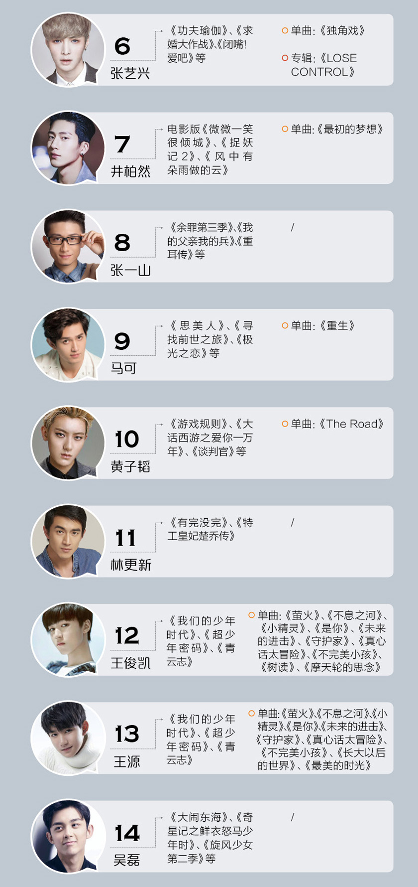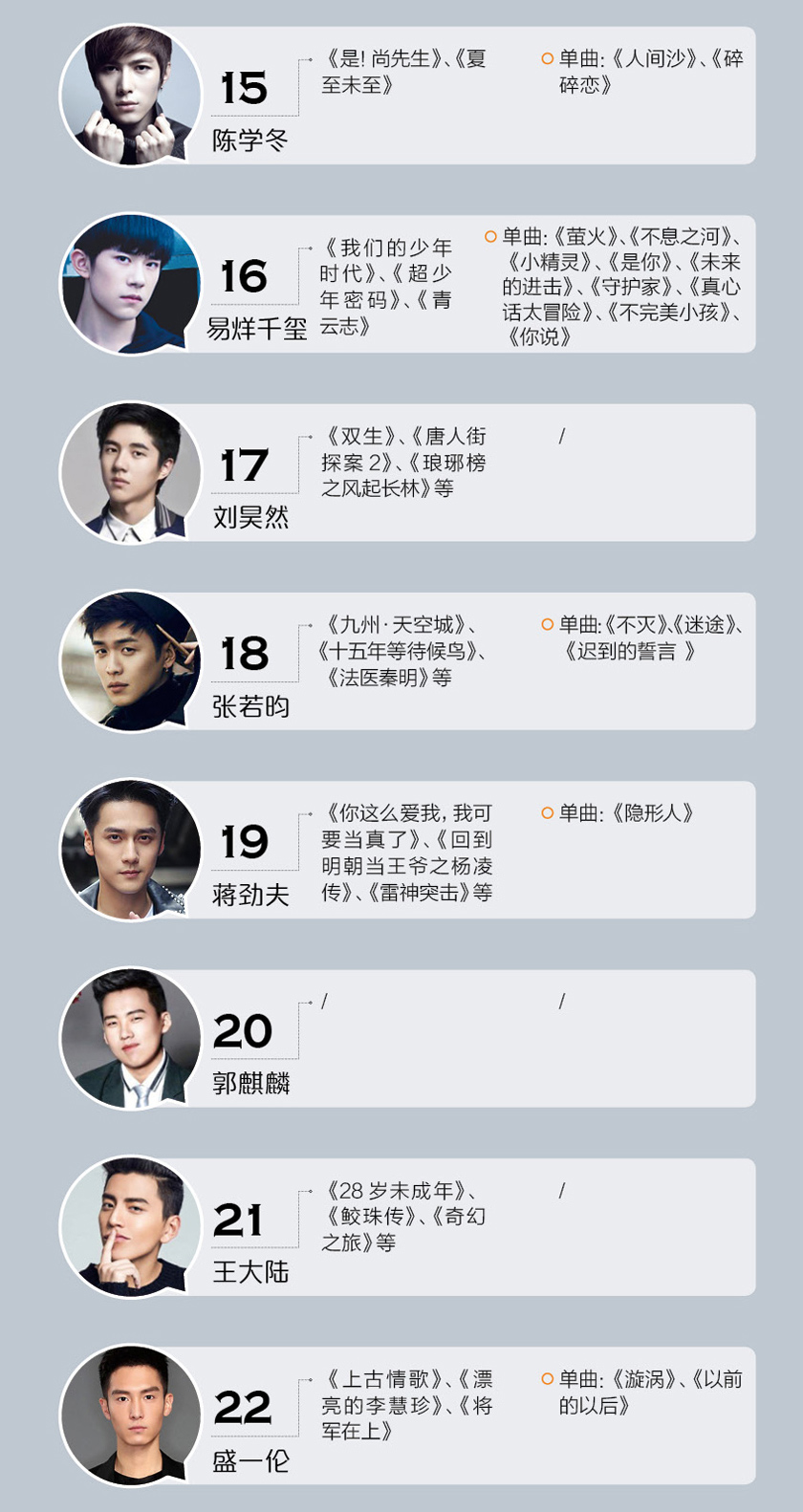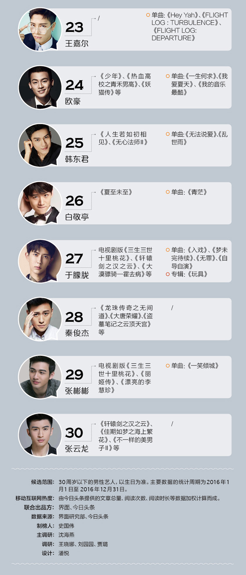 可能有人会奇怪,为什么没有陈伟霆、马天宇等当红小生,那是因为他们已经超过30岁了,不在我们的候选范围内。值得注意到的一点是榜单中的李易峰、陈晓都即将跨入30岁的门槛,这些小鲜肉们不再鲜之后,演艺道路怎么走?是否能够成为长期流量担当,转为娱乐圈常青树?都是值得思考的问题。