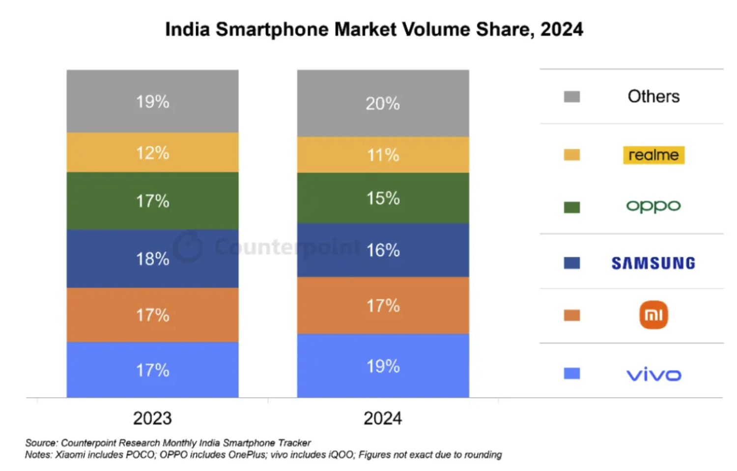 1月31日,根据Counterpoint的《月度印度智能手机市场追踪报告》,2024年印度智能手机市场的批发营收同比增长9%,创下历史新高;智能手机出货量同比增长1%,达到1.53亿台。