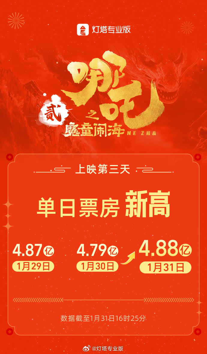据灯塔专业版,截至今日16时25分,影片《哪吒之魔童闹海》上映第三天票房已达4.88亿元,上映以来单日票房新高。