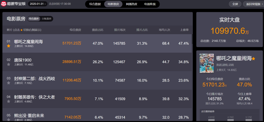 据猫眼专业版数据,截至1月31日16时7分,电影《哪吒之魔童闹海》1月31日单日票房突破4.79亿,超1月30日票房成绩,实现票房逆跌。
