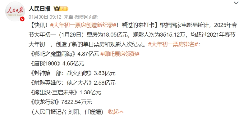 今年的春节档电影,从预售期间就备受关注。2025电影春节档自19日开启预售当天,便短时间内连续突破预售票房纪录;上映后,大年初一(1月29日)单日票房为18.05亿元,观影人次为3515.12万,创造了新的单日票房和观影人次纪录;其中,《哪吒之魔童闹海》、《唐探1900》、《封神第二部:战火西岐》分别以4.87亿元、4.65亿元、3.83亿元的票房位列票房TOP3。