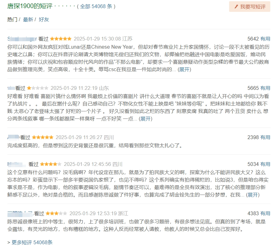 豆瓣评分6.7的《唐探1900》,虽然在口碑上落后于《哪吒2》,但票房却与《哪吒2》相差不大。小红书和豆瓣上很多网友对《唐探1900》褒贬不一,有人认为这部影片推理不足,强上价值很尴尬;有人则认为故事始终围绕一个主题层层推进,拍摄也非常有年代质感,想去电影院二刷。